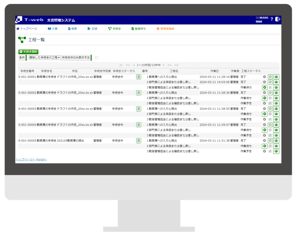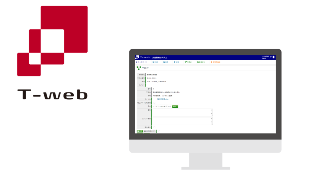 ITツール『T-web』とは ISO認証の東京スタンダード株式会社TOPITツール『T-web』とは ITツール「T-web」 T-webは、クラウド上で文書管理や社内手続き、マネジメント管理ができるITツールです。豊富な文書テンプレートが、マネジメントシステムの構築をサポートします。 資料をダウンロードする ー T-web解説動画 概要編 ー お使いのブラウザは動画タグに対応していません。 ー T-web解説動画 構築編 ー お使いのブラウザは動画タグに対応していません。 ー T-web解説動画 運用編 ー お使いのブラウザは動画タグに対応していません。 ❮ ❯ ●T-web 機能一覧 作成 文書テンプレート 承認 承認フロー 承認 進捗管理 承認 承認者設定 承認 アラート 情報管理 ファイル管理 情報管理 版数管理 情報管理 キーワード辞書 情報管理 記録検索 ユーザー管理 権限管理 ユーザー管理 グループ ユーザー管理 手続き履歴 その他 お知らせ 作成 文書テンプレートで文書作成の手間を軽減 ✓ 豊富な200種類のテンプレート✓ 編集して自社に合った文書を作成 機能詳細を見る 承認 クラウド上で承認をスムーズに ✓ 書類準備の手間や回覧時間を軽減✓ 進捗管理で状況が分かる 機能詳細を見る 情報管理 一元管理で書類管理が効率化 ✓ 文書や書類をすぐに探せる✓ 文書や書類を最新の状態で保持 機能詳細を見る T-webで、ISO認証での文書管理の負担を削減しましょう T-webの資料をダウンロードする