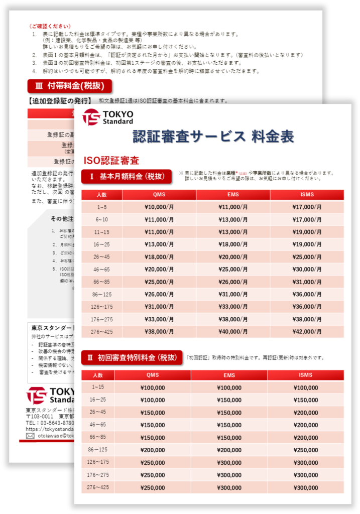 ISO認証審査、T-webサービス、アカデミーサービスの料金表をダウンロードいただけます。