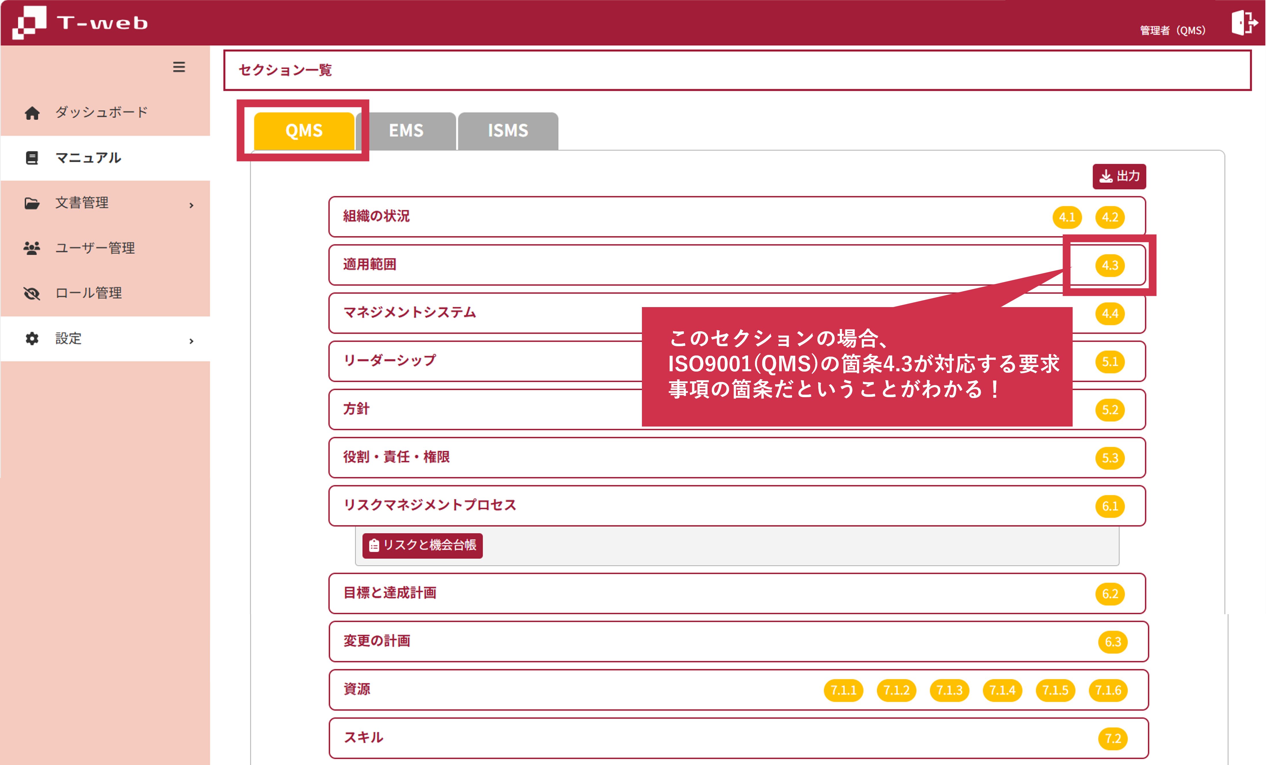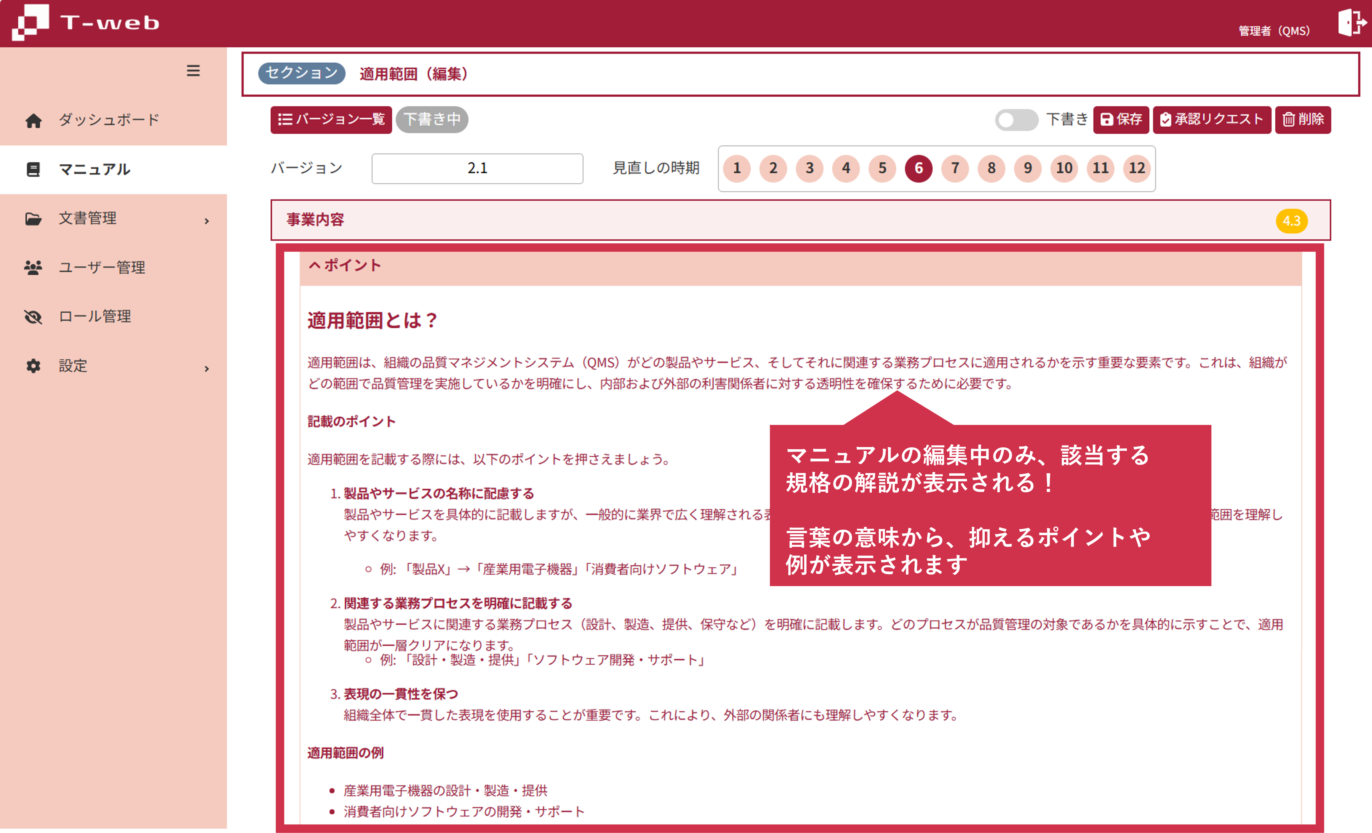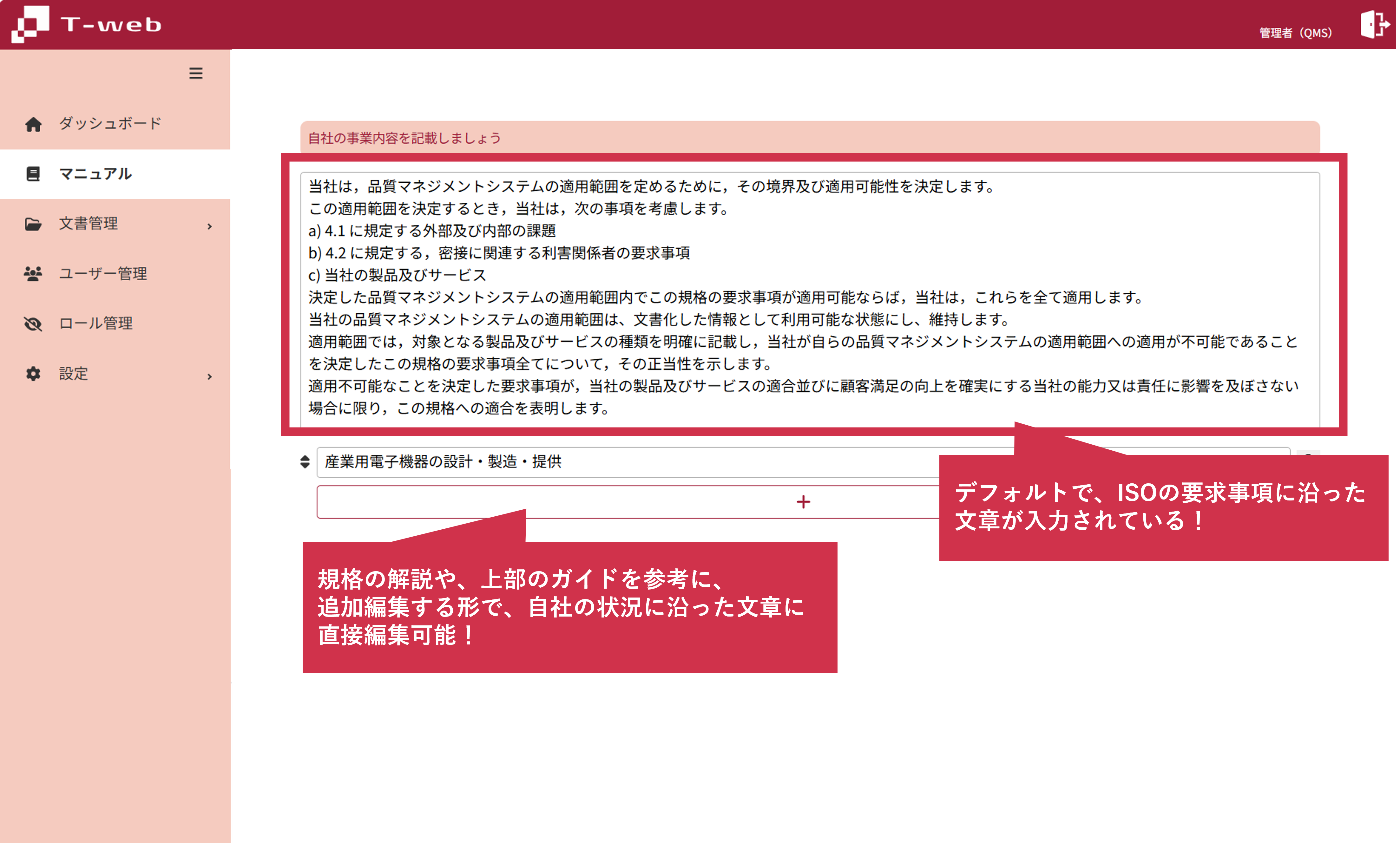 T-webの同じ画面上に、文書の作成画面と、規格要求事項のポイント解説やガイドがあるので、専門的な知識がなくても、マニュアルの作成が円滑に行えます。