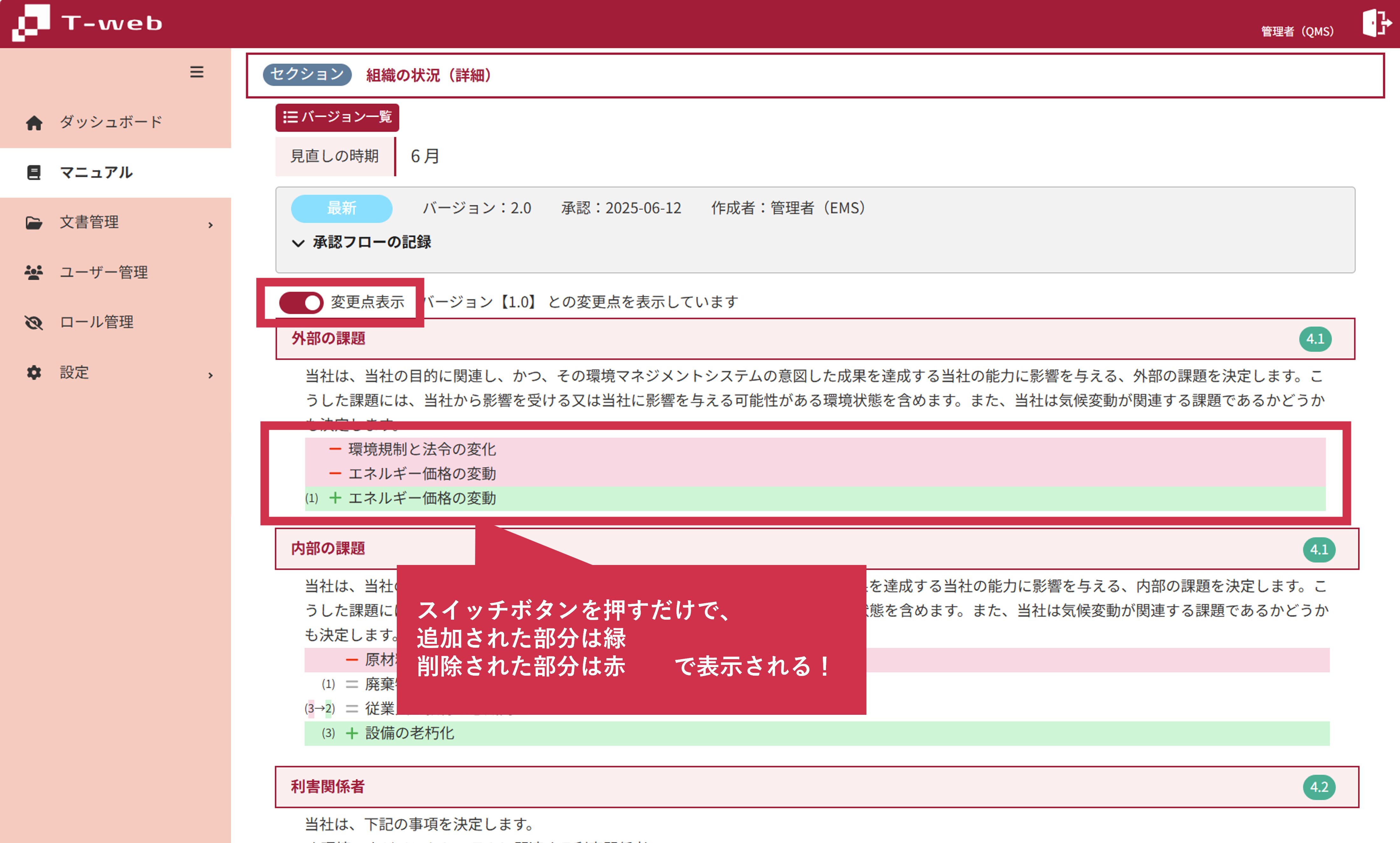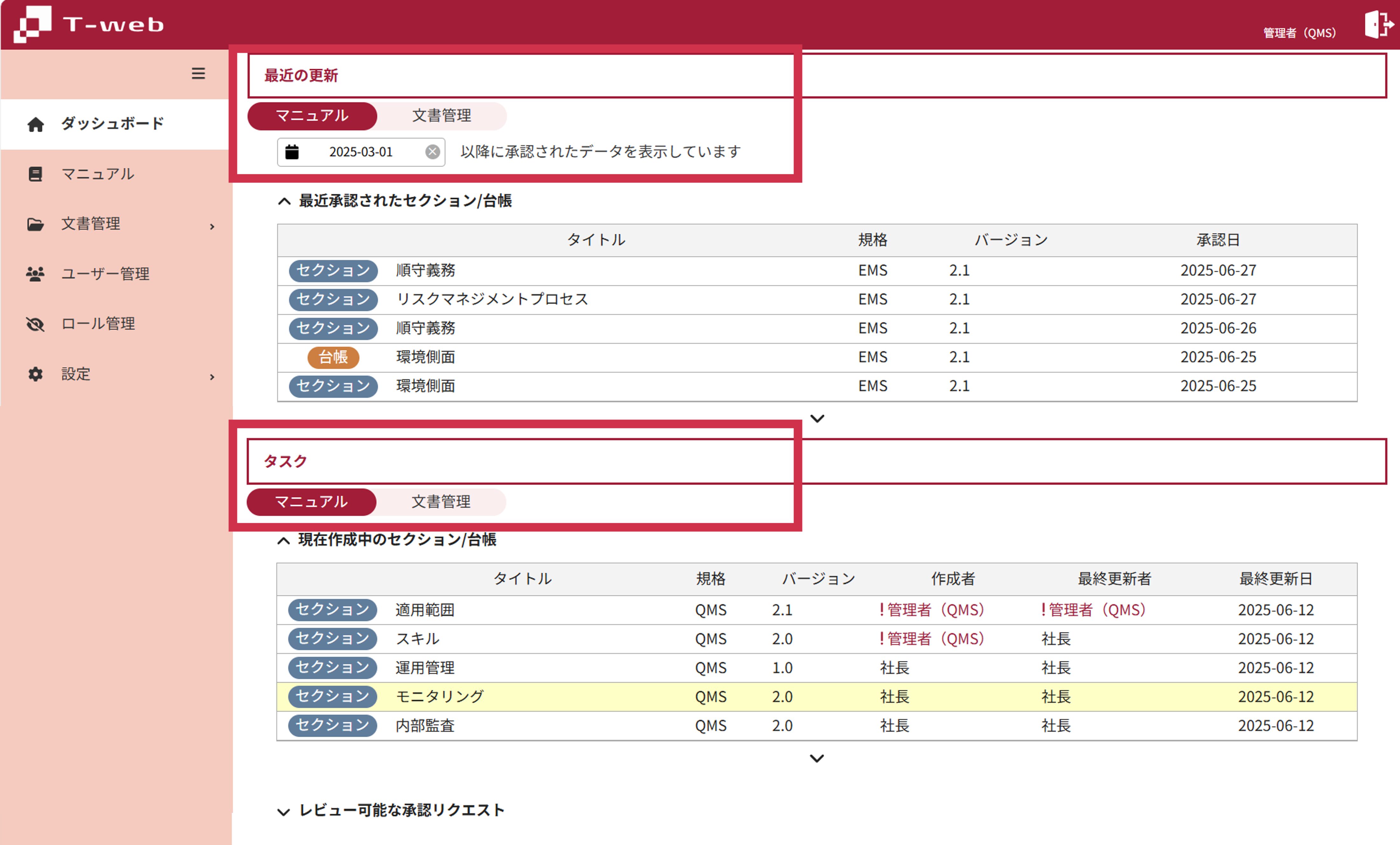 文書の更新情報や自分のタスクの確認だけでなく、マニュアルの変更点を一目で把握することもできます。