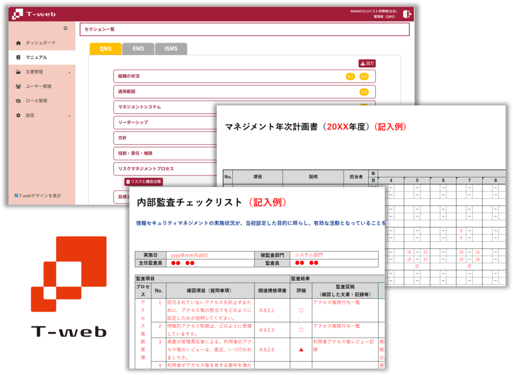 | T-web | 専任スタッフのサポート有。テンプレートも豊富 | マニュアル、チェックリスト、作業記録、ISO取得に向けた文書作成 |