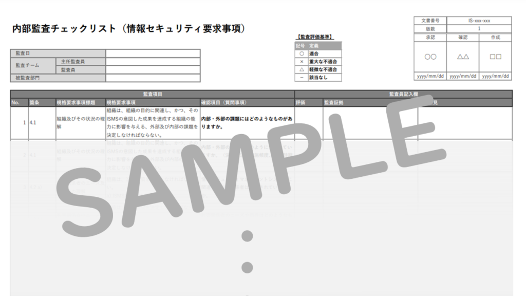 内部監査でそのまま使えるチェックリストを無料配布中!要求事項だけでなく、質問形式に内容を落とし込み、記入例や説明もあるので、初めて内部監査を実施する方にもおすすめです。